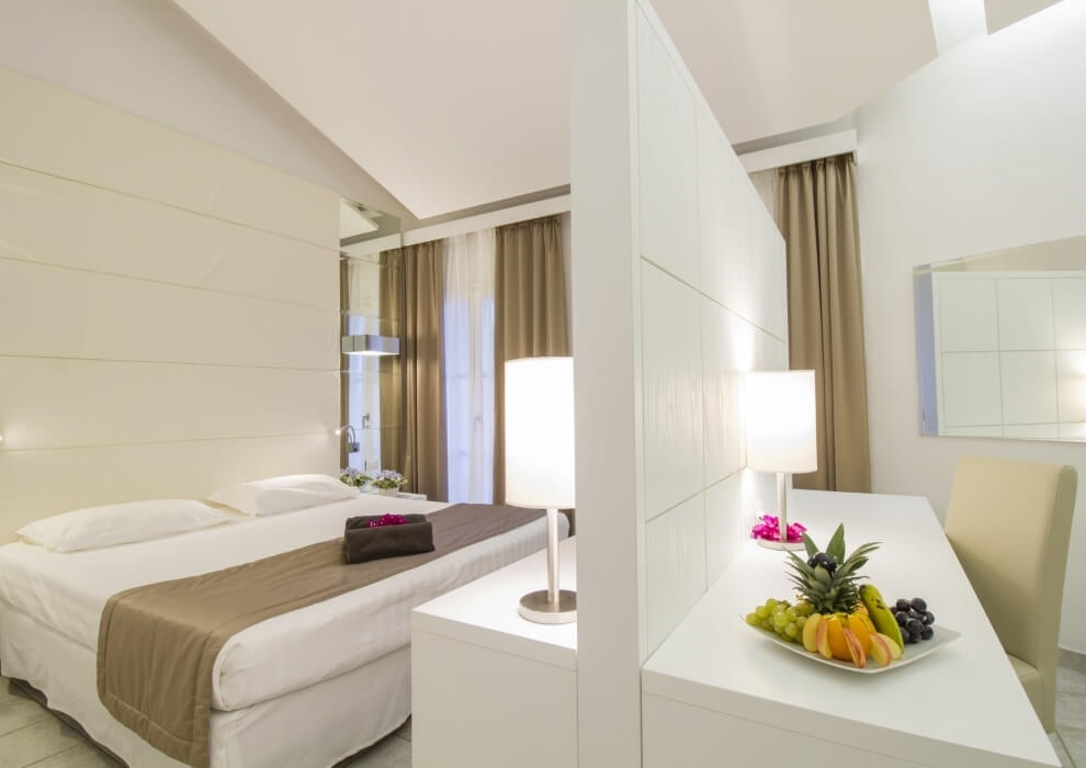 All 85 rooms are tastefully furnished in a modern style and are characterised by bright rooms. The rooms on the ground floor have a private veranda furnished with a table and chairs, while those on the first floor have a terrace or a small balcony with a railing. The Superior Deluxe and Premium Deluxe rooms are different due to a larger room size and a sitting area at the entrance that includes a dormeuse that can also be used as a third bed.