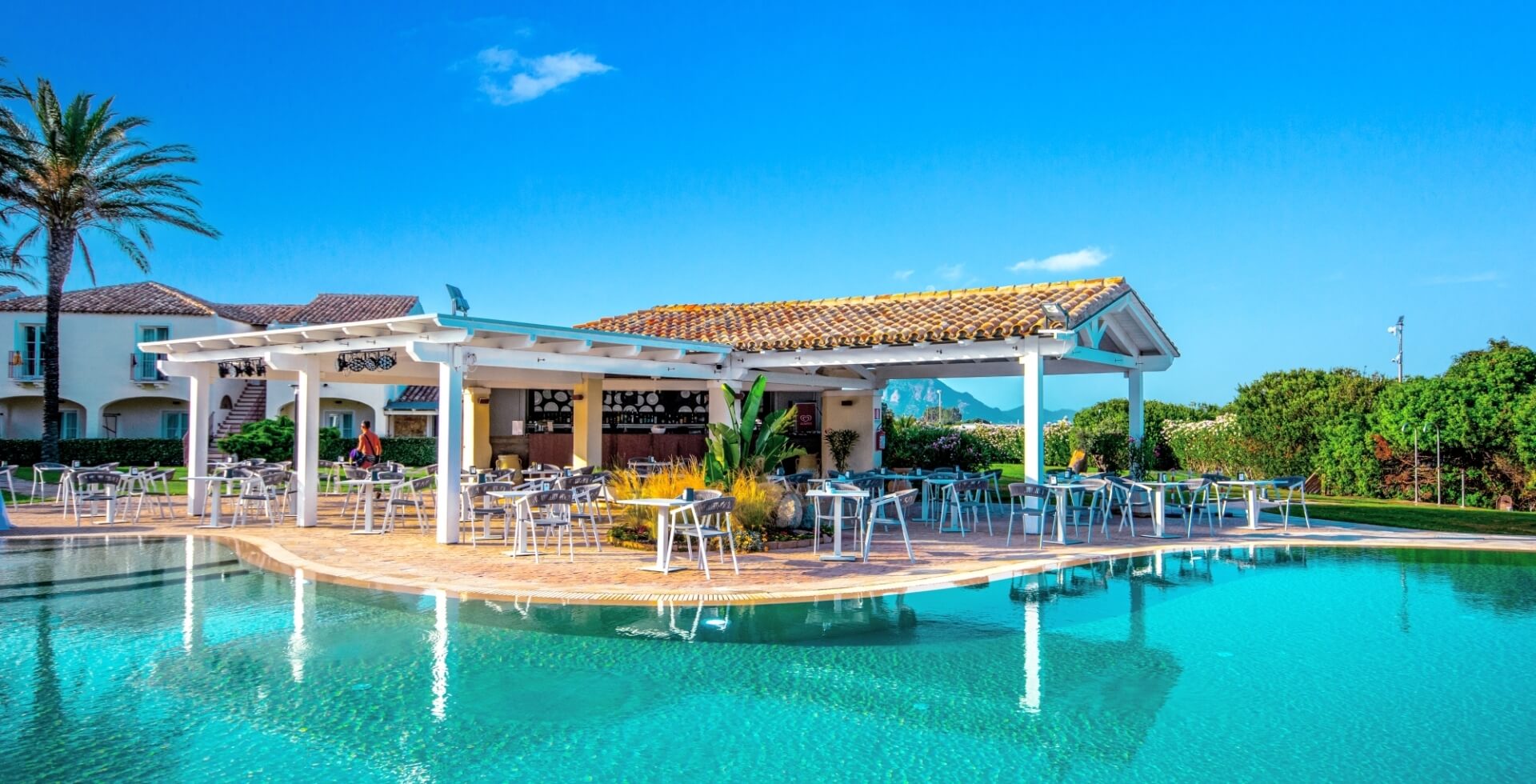 By the pool is also the bar where you can enjoy drinks and cocktails for aperitifs or evening shows.