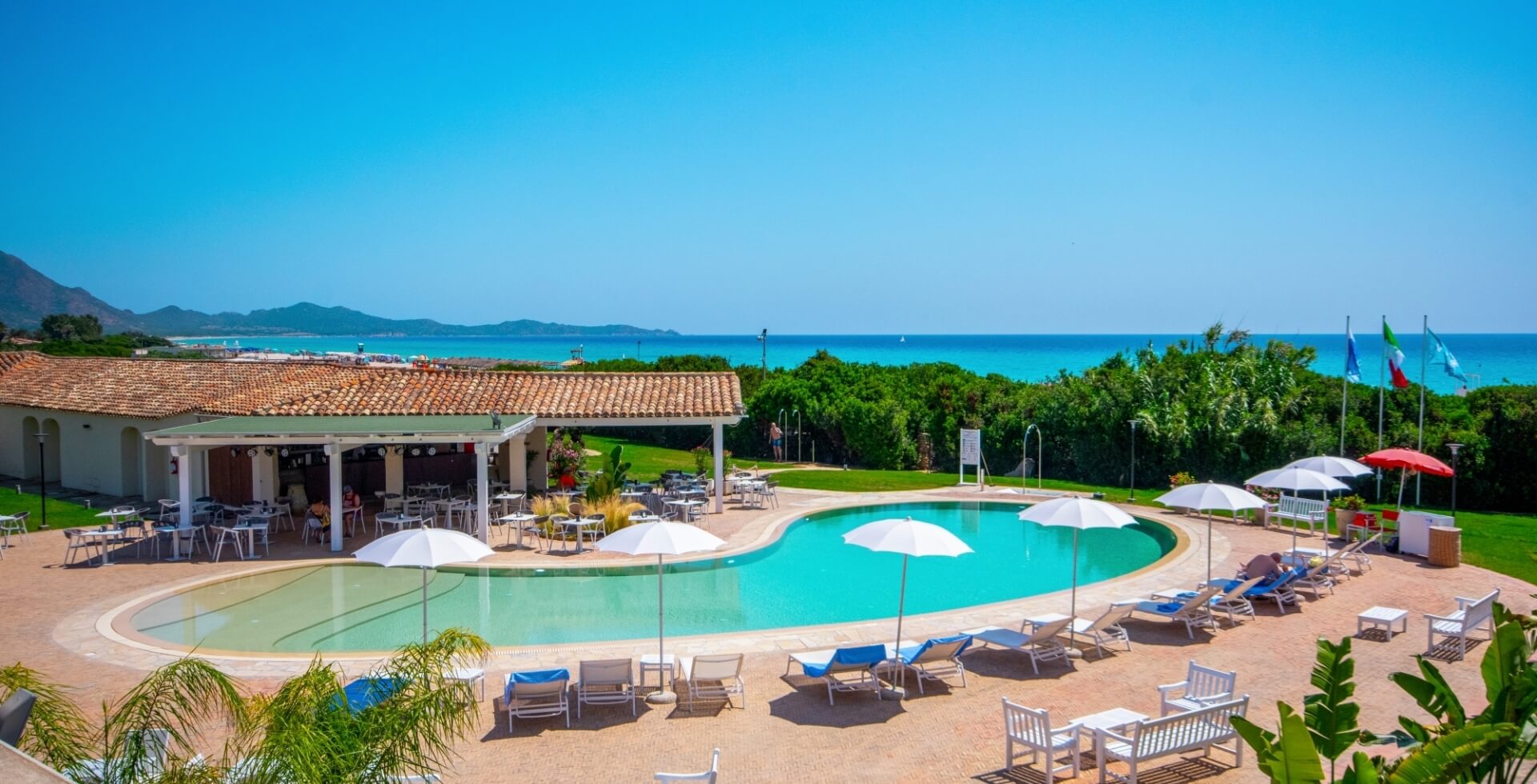 The Resort's swimming pool is in front of the restaurant and just a few metres from the beach. It is easily accessible by a few steps and a sloping seabed and is surrounded by a relaxation area with sunbeds and umbrellas.
