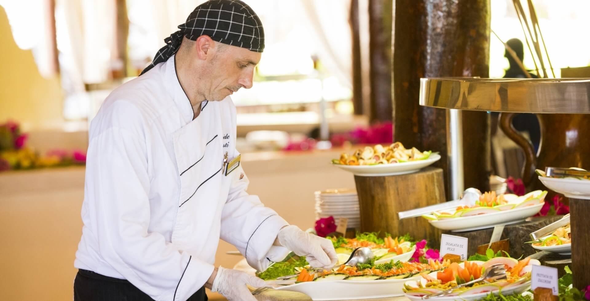 In quello principale gusterete il pescato locale di primissima qualità e ricette della cultura mediterranea impreziosite talvolta dalle magiche spezie dell'isola. Da non perdere il buffet dei dolci e la grandissima varietà di frutta esotica fresca.